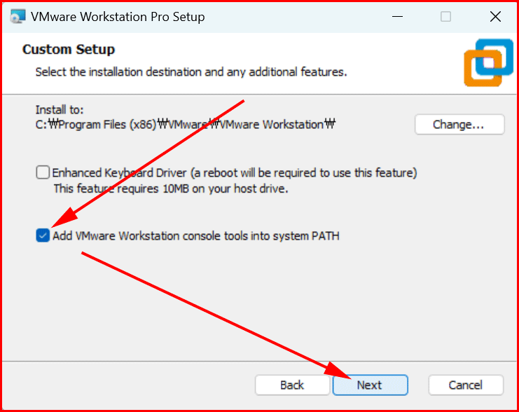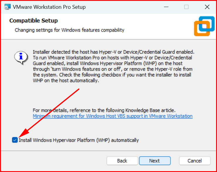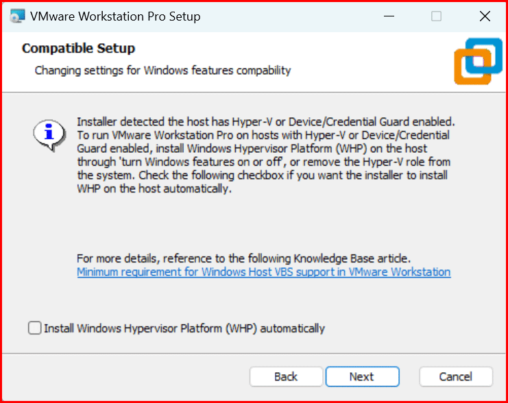 최신 컴퓨터나 노트북에는 하드웨어적으로 가상 머신을 지원하는 환경이 있습니다. 여기에 대한 설정인데, 지금 설치하려는 VMware는 소프트웨어적으로 가상화를 가능하게 하는 것입니다. 'Hypervisor Platform'을 설치하지 않아도 됩니다. 자신의 시스템 이해가 충분하면 거기에 맞게 옵션을 선택하면 되지만, 잘 모를 때는 아래 옵션의 'automatically'를 선택하면 됩니다.