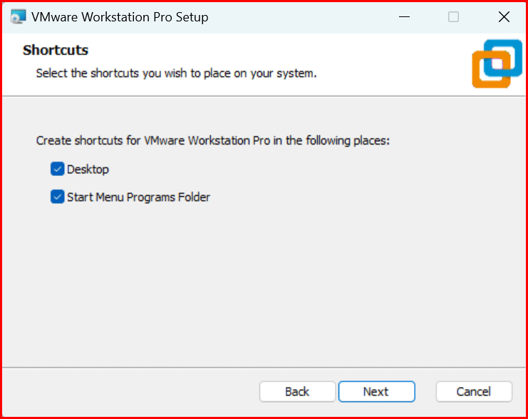 단축 아이콘을 배치하는 국면입니다. 바탕화면에도 시작 메뉴에도 'VMware'프로그램 시작 아이콘을 두고자 한다면 모두 선택합니다.