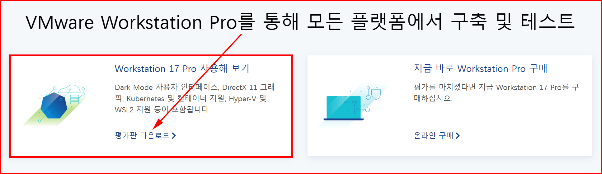 VMware Workstation Pro를 설치하면 위 Player는 자동으로 설치되기 때문에 Player를 다운로드하지 않고 바로 'VMware Workstation Pro 평가판'을 다운로드합니다.