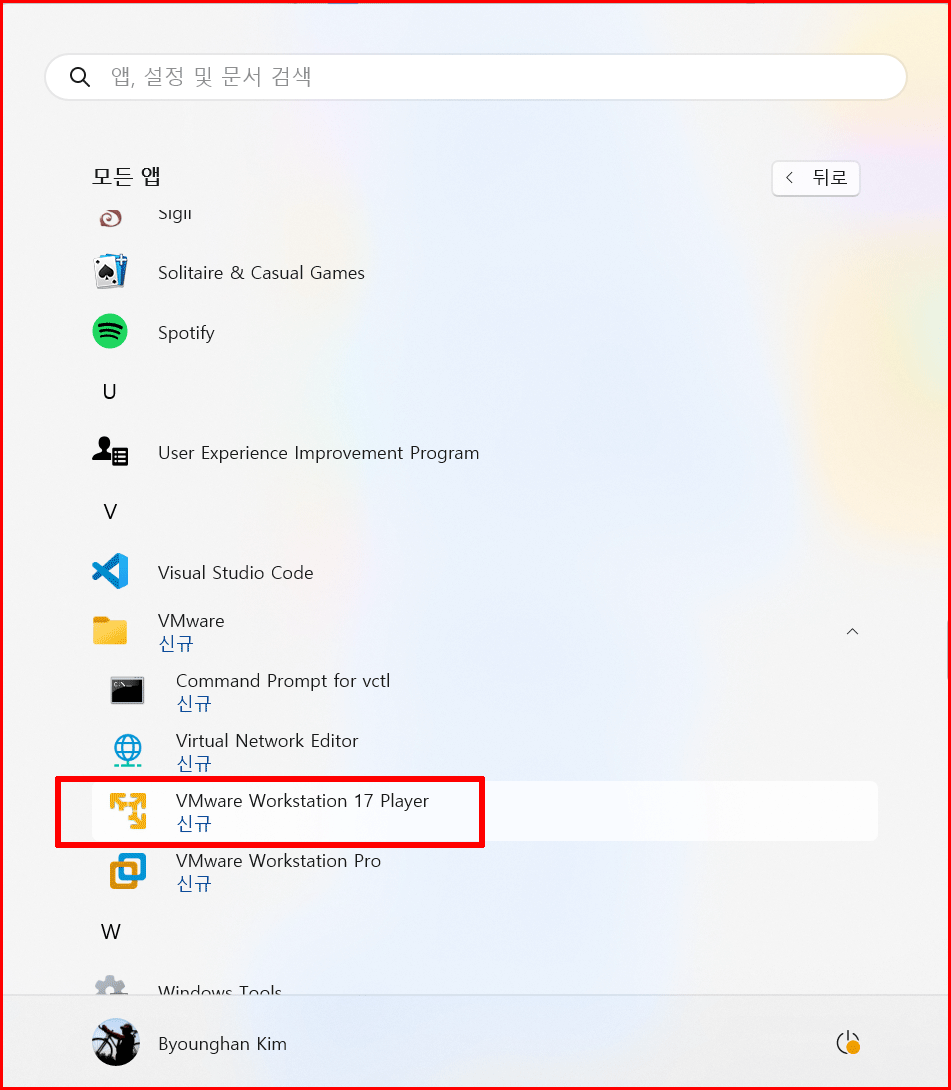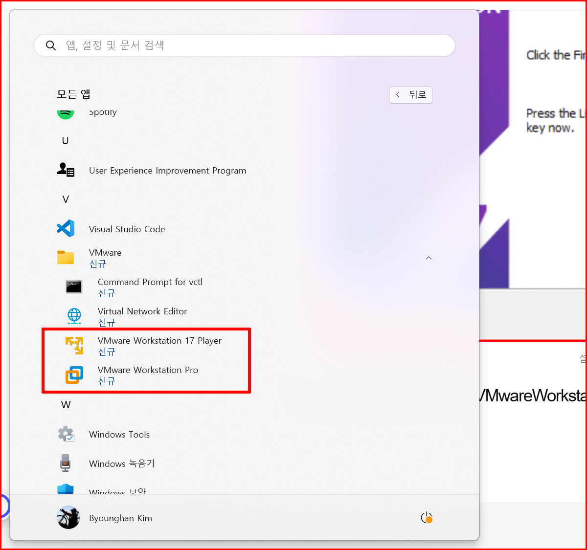 설치가 끝나면 '모든 앱' 또는 '모든 프로그램'을 선택하여 설치된 프로그램을 확인합니다. 아래와 같이 Player와 Pro가 설치된 것을 알 수 있습니다. 이미 살폈듯이 'VMware Workstation Pro'는 유료이기 때문에 '평가판'을 30일간 이용할 수 있습니다. 설치 후 30일 기간이 지나면 더 이상 실행이 되지 않습니다. Pro와 관련된 프로그램 설정은 이 기간에 모두 끝내면 더 이상 사용할 필요는 없습니다.