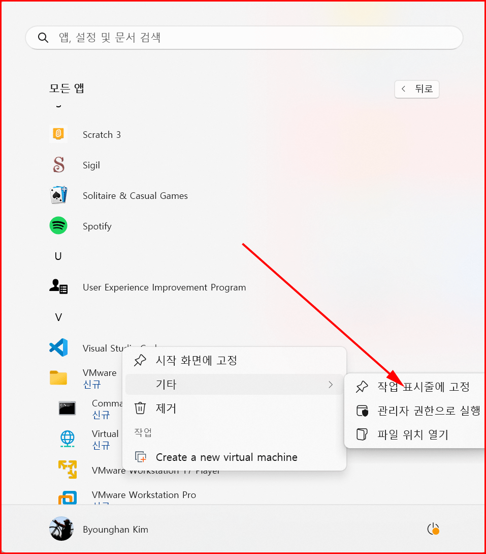 작업 표시줄에 고정합니다. 매번 '모든 앱'에서 실행하는 것보다 아래 '작업 표시줄' 패널을 통해 실행하는 것이 편합니다. 방법은 '모든 앱'에서 'VMware Workstation Player'를 찾아 우클릭하여 '작업 표시줄에 고정'을 선택합니다. 바로 아래 '작업 표시줄' 패널에 아이콘이 등록됩니다.