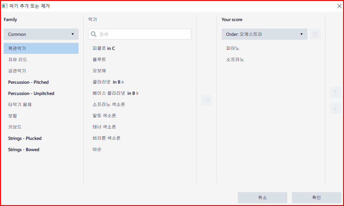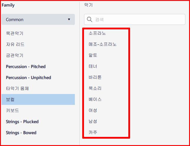 뮤즈스코어 왼편 패널에는 '팔레트', '악기', '속성'이 있습니다. 두 번째 '악기'를 선택하면 '추가' 버튼이 있습니다. 이 버튼을 클릭하면 악기 Family별로 악기를 찾을 수 있습니다.