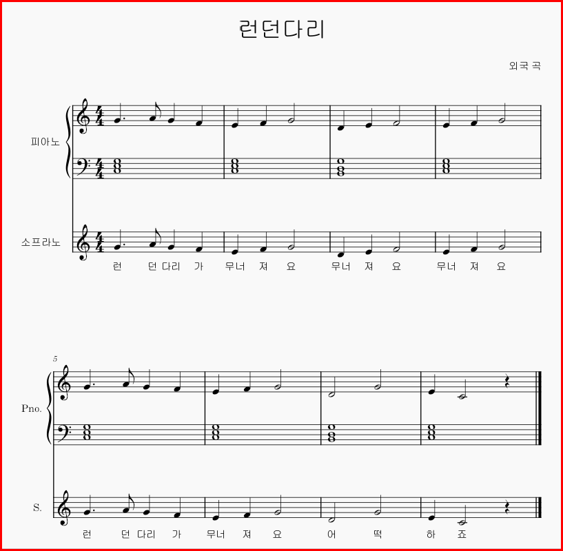 동요 런던다리 악보에 보컬을 추가해 보겠습니다. 다른 악기 추가 요령도 같습니다.
