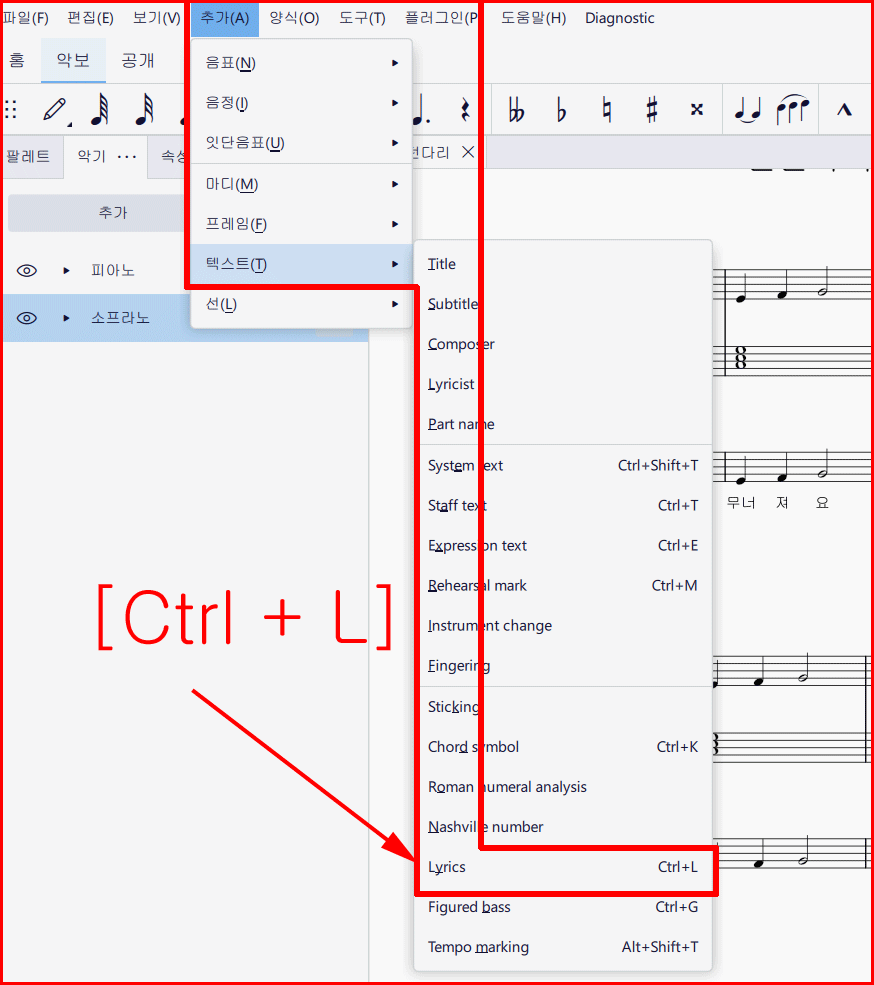 먼저 가사 넣을 음표를 선택합니다. 메뉴 '추가'에서 '텍스트'를 선택하면 다양한 텍스트 입력 종류가 나옵니다. 그중에서 'Lyrics'를 선택합니다. 단축키는 'Ctrl + L'입니다. 단축키 사용이 간편합니다.