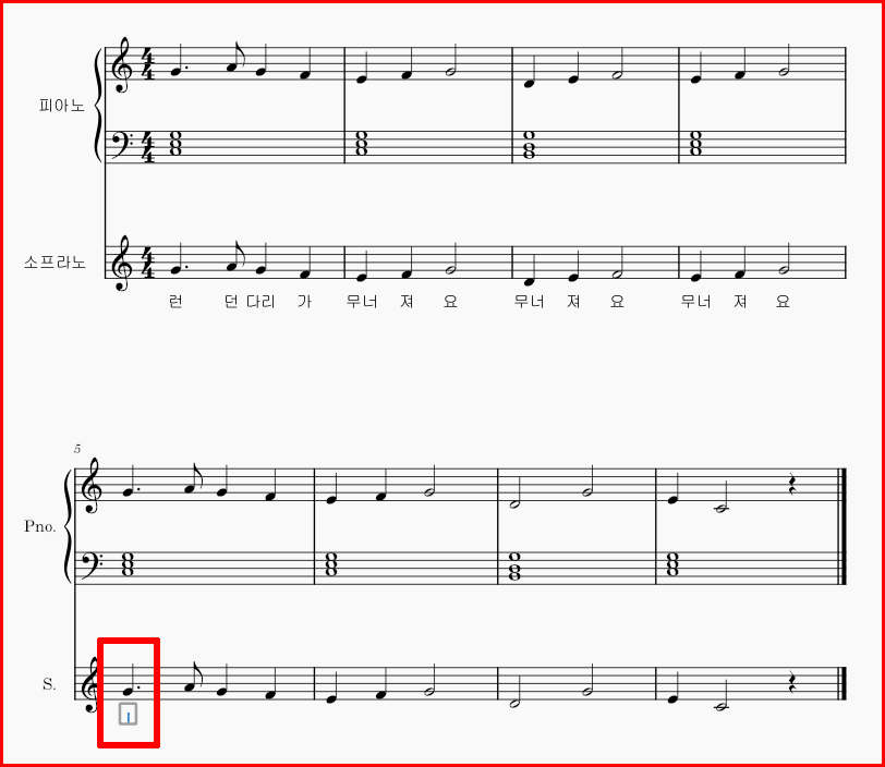 가사는 워드프로세서 타이핑하듯이 입력하면 되는데, 다음 음표로 이동하는 것은 '스페이스 바'입니다. 위 악보 런던다리에서 '런'을 입력하고 스페이스, '던'을 입력하고 스페이스. 이런 식으로 입력을 진행합니다. '다리'는 한 음표에 두 글자가 들어가니까 그대로 '다리'를 타이핑하고 스페이스 바를 누르면 다음 음표로 이동됩니다.