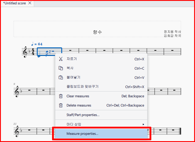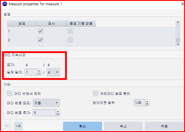 못 갖춘마디 등 특별한 사정이 있는 마디는 '속성' 창에서 변경합니다. 아래 그림은 우리 가곡 '향수' 시작하는 첫마디가 '못갖춘마디'이기에 이것을 설정하는 경우입니다.
