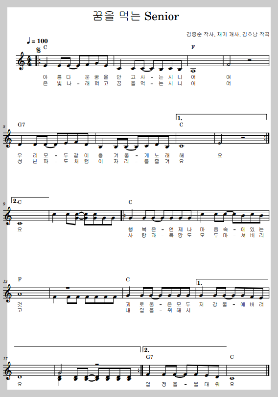 "아름다운 꿈을 안고사는 시니어여 / 우리 모두 같이 흥겨웁게 노래해요 / 행복은 언제나 마음속에 있는 것 / 괴로움은 모두 저 강물에 버려요"