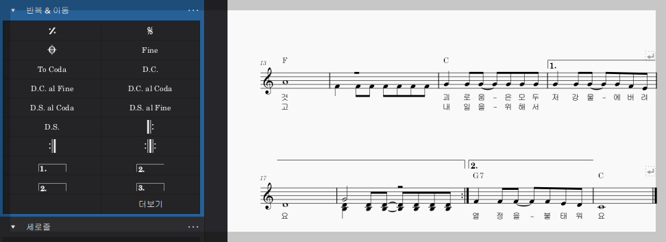 개사된 가사글을 반영해서 뮤즈스코어로 사보를 했습니다. 사보 과정에서 새 사실을 알았습니다. 악보에서 사용되는 '반복기호'인 '1'과 '2'에서 '1'의 경우에 마디를 선택하고 적용해야 했습니다. 이것을 매번 틀려 연주를 하면 이 부분에서 어긋났거든요. 아래 악보에서 처음 연주되는 부분은 세 마디이기 때문에 마디 셋을 선택하여 반복기호 '1'을 클릭하면 적용되었습니다. 나중에 '2'는 그대로 연주되는 것이기에 뒤가 막혀있지 않습니다.