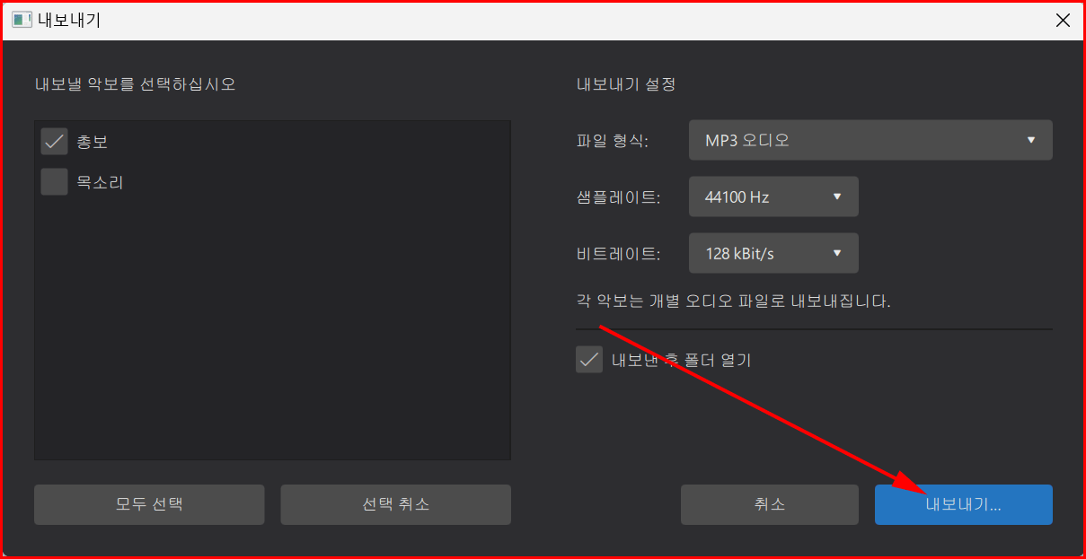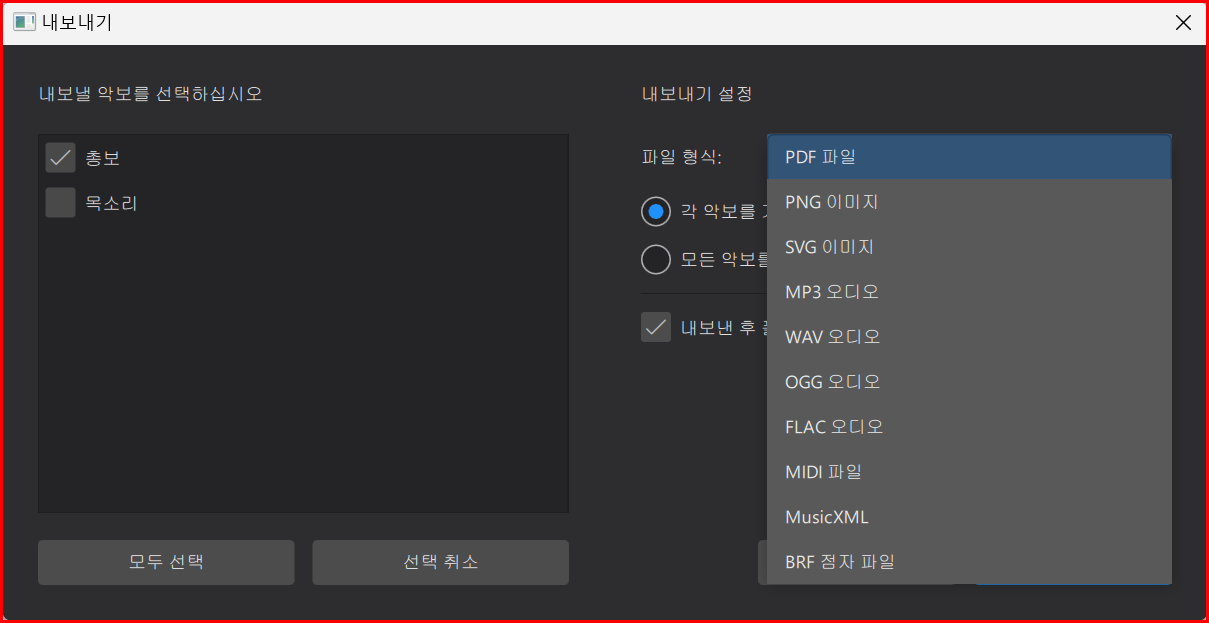 내보낼 악보는 여러 악기와 목소리를 사용하는 경우에는 '총보' 등 선택한 종류대로 파일이 생성됩니다. 총보는 모든 악기의 합주 형태로 오디오 파일이 만들어집니다. 이 경우는 PDF 파일로 만들 때도 같습니다.