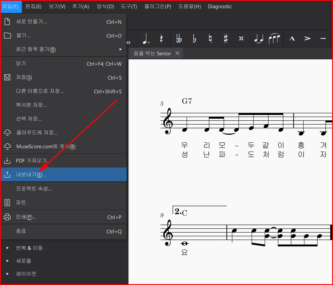뮤즈스코어에서 사보한 악보는 여러 형태로 내보내기를 할 수 있습니다. '내보내기'는 파일 메뉴에서 내보내기를 선택합니다.