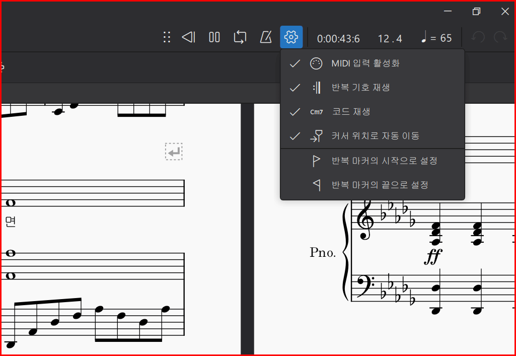 뮤즈스코어 음악 재생에 관한 아이콘은 화면 우상단에 배치되어 있습니다. 재생 버튼 오른편에 설정 아이콘을 열면 몇 가지 옵션이 있습니다. 기본적으로 네 가지는 선택되어 있고, 반복 옵션은 해당되는 부분에서 선택하여 집중적으로 반복 재생을 할 수 있습니다.