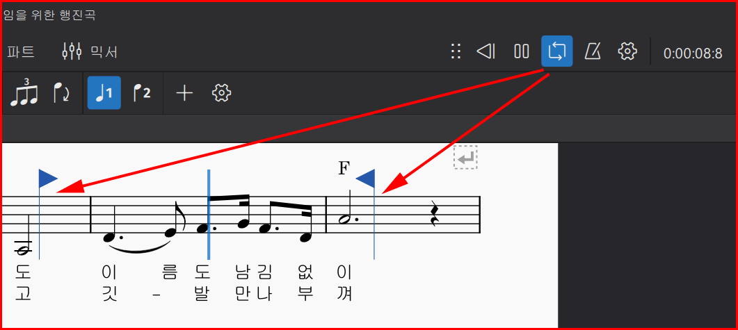 '반복 기호 재생'을 해제하면 반복하지 않고 재생됩니다. 이 옵션도 재생 중에 선택과 해제가 가능합니다.