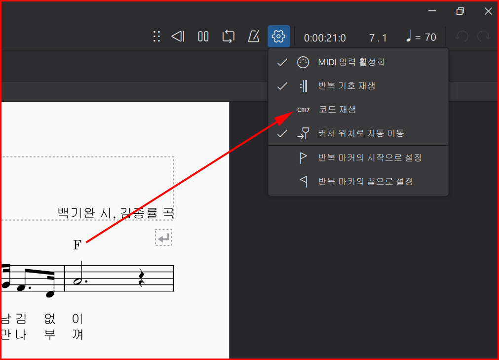 코드 재생을 생략하려면 선택을 해제하면 됩니다. 음악 재생 중에도 다시 선택하면 코드를 재생해 줍니다.