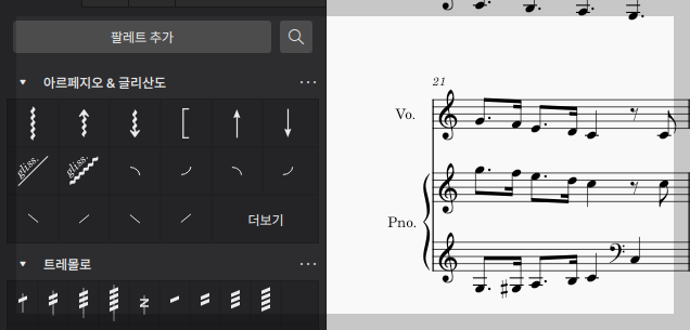 뮤즈스코어의 여러 팔레트 중에 기본 팔레트가 아닌 경우는 추가하여 사용합니다. '아르페지오 & 글리산도'도 그 하나입니다. '팔레트 추가'로 '아르페지오 & 글리산도'가 추가된 상태에서 'Wavy Glissando'를 선택합니다.