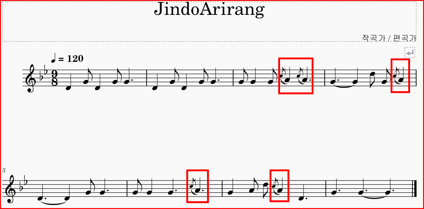 아래 진도아리랑에서 꾸밈음은 다섯 군데가 있습니다.