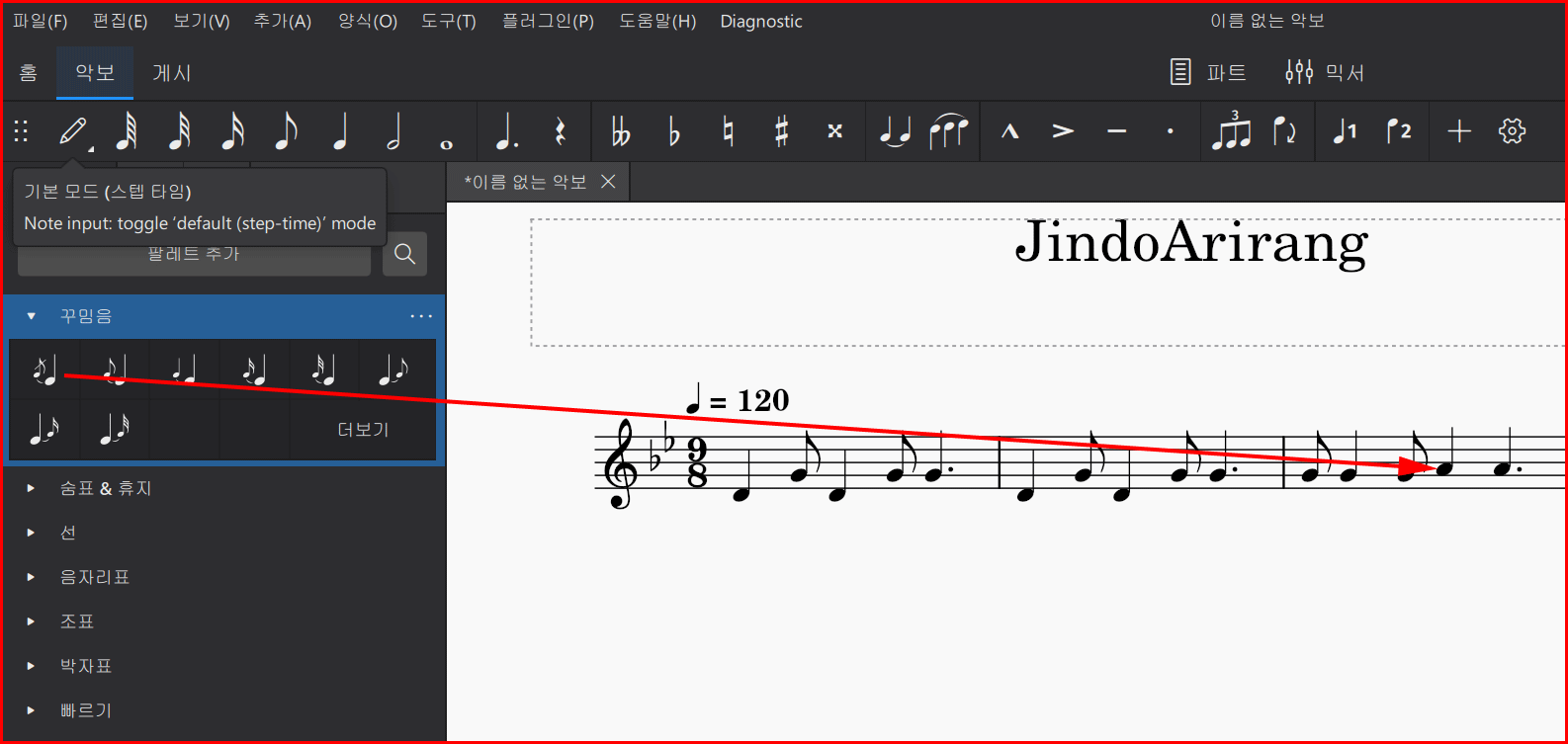 꾸밀 음을 먼저 선택합니다. 팔레트 '꾸밈음'에서 해당 꾸밈음을 클릭하면 원음을 꾸미게 되는데 처음 위치는 같은 음계에 표시됩니다. 화살표 키를 이용하여 해당 부분까지 올리거나 내려서 위치를 정합니다. 이음줄로 마감합니다.
