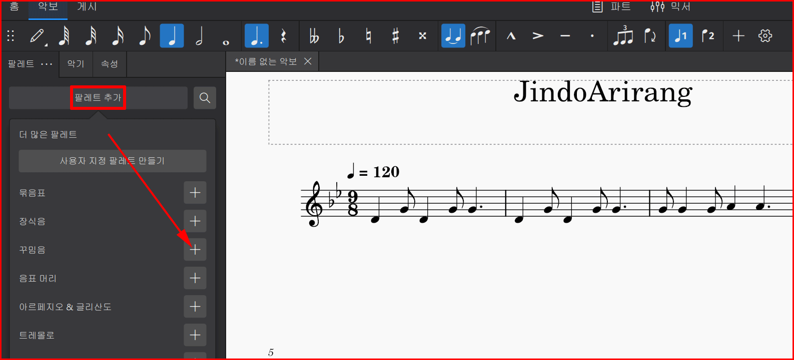 기본 팔레트가 없을 때에는 '팔레트 추가'를 통해 '장식음' 등을 사용할 수가 있습니다. '팔레트' 탭을 열고 '팔레트 추가'를 선택하면 사용 가능한 팔레트들이 보입니다.