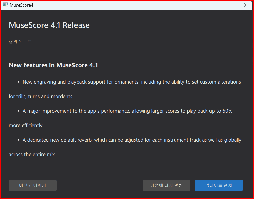 뮤즈스코어가 버전이 4.1로 업데이트됐습니다. 다음 사항이 달라졌다고 합니다.