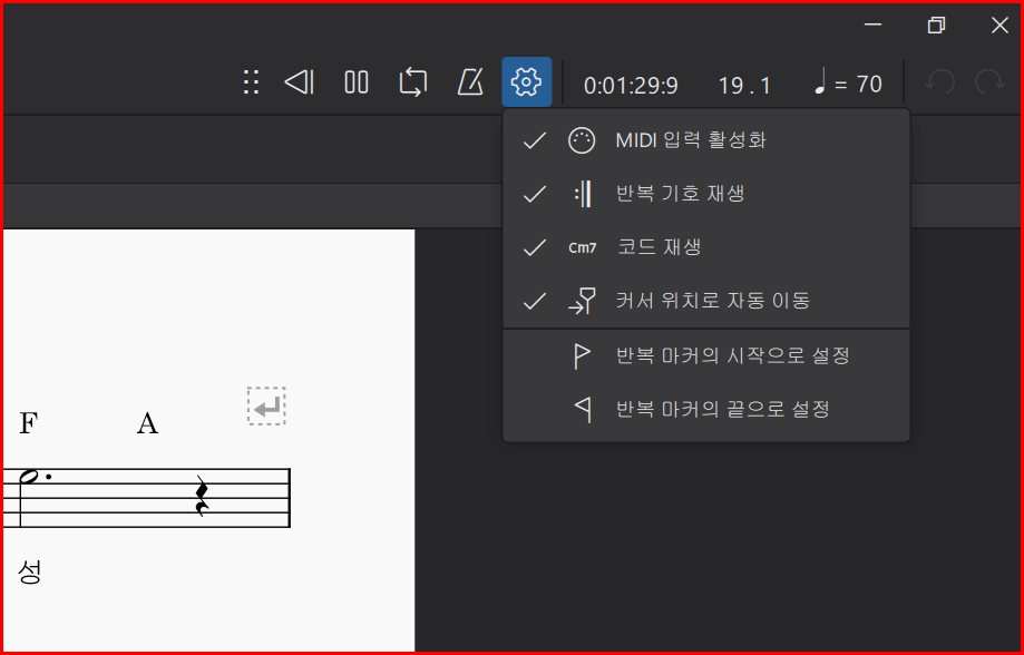 뮤즈스코어 음악 재생에 관한 아이콘은 화면 우상단에 배치되어 있습니다. 재생 버튼 오른편에 설정 아이콘을 열면 몇 가지 옵션이 있습니다. 기본적으로 네 가지는 선택되어 있고, 반복 옵션은 해당되는 부분에서 선택하여 집중적으로 반복 재생을 할 수 있습니다.