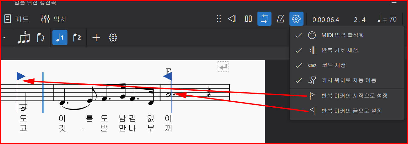 반복의 시작과 끝을 설정하는 것은 설정 아이콘을 선택하여 아래에 있는 곳을 택하면 변경됩니다. 시작 부분에는 '반복 마커 시작으로' 설정하고, 끝 부분에는 '반복 마커 끝으로' 설정합니다.
