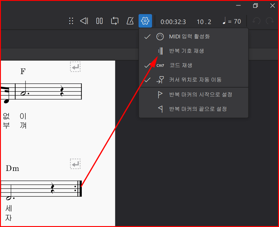 '반복 기호 재생'을 해제하면 반복하지 않고 재생됩니다. 이 옵션도 재생 중에 선택과 해제가 가능합니다.