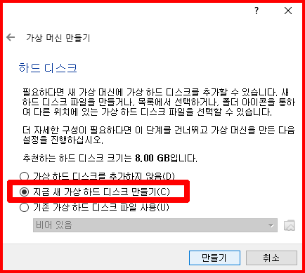 가상하드디스크를 만듭니다. 대화상자에서 만들기를 선택하면 위에 설점한 머신 폴더 안에 파일이 추가됩니다.