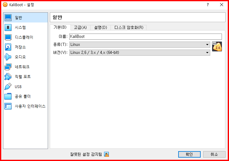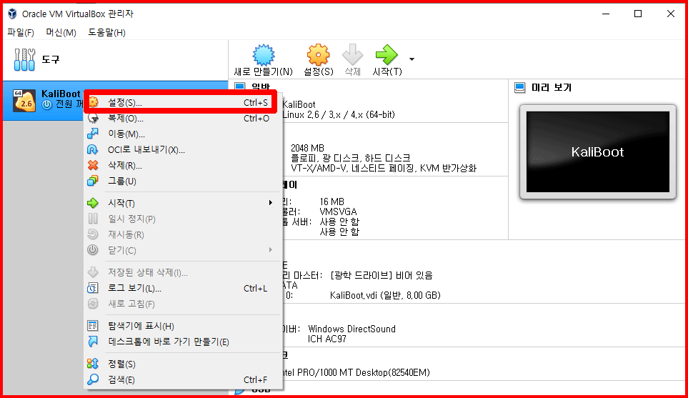 버츄얼박스 메인화면으로 가서 왼쪽 VM목록에서 새로 만든 칼리 리눅스를 선택하고 마우스 우클릭을 합니다.
