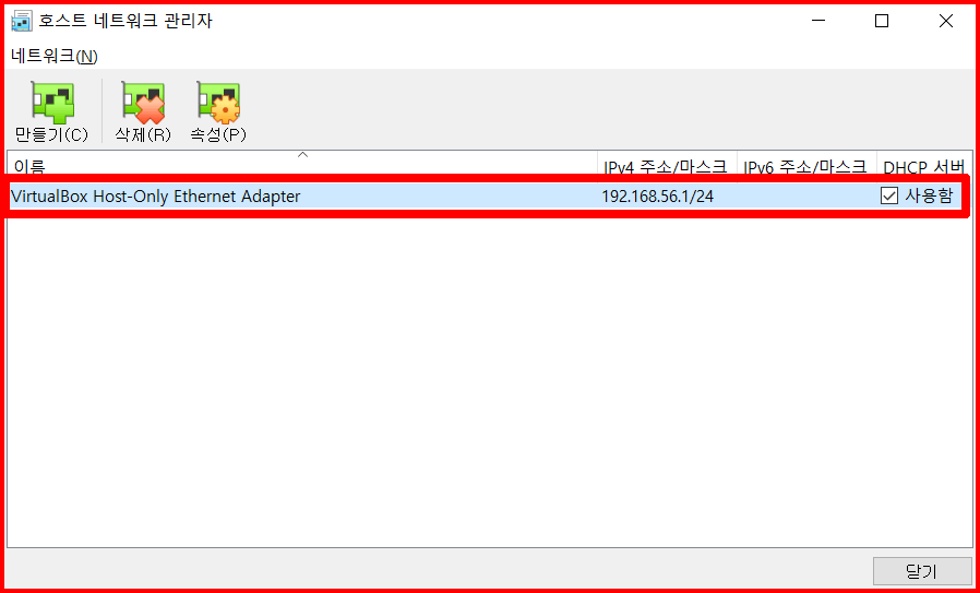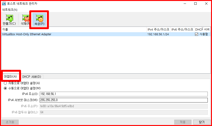 버츄얼박스가 기본적으로 지은 이름인 'VirtualBox Host-Only Ethernet Adapter'로 생성됩니다. 여기서 '어댑터' 속성과 'DHCP 서버' 속성을 결정합니다.