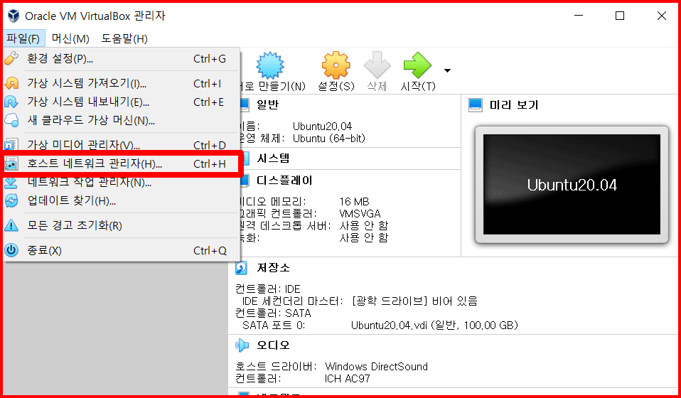 버츄얼박스 '파일' 메뉴에 있는 '호스트 네트워크 관리자'를 선택합니다.