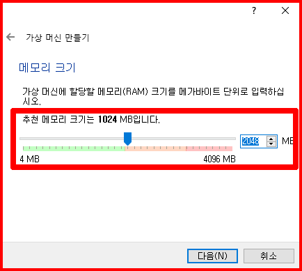 다음은 메모리 크기 섹션입니다. 슬라이더 또는 입력 칸을 이용해서 VM이 사용할 최대 메모리 크기를 정합니다. 칼리를 실행하려면 적어도 1GB가 필요합니다. 시스템 여건에 따라 조정합니다.