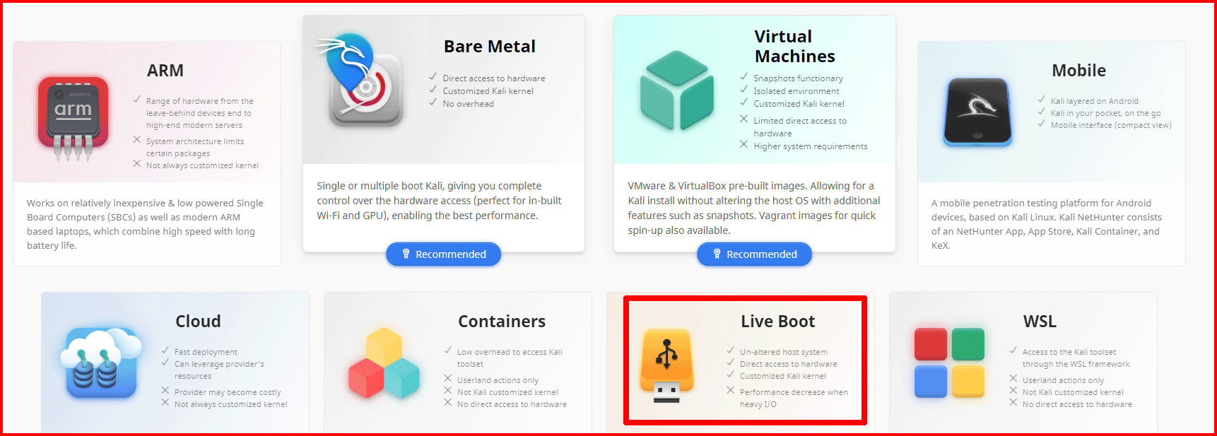 칼리 리눅스는 데비안 계열의 배포판입니다. 아래 여러 버전이 있는데, 시스템의 아키텍처에 맞는 버전을 고릅니다. 내려받는 파일의 확장자는 [.iso]입니다.