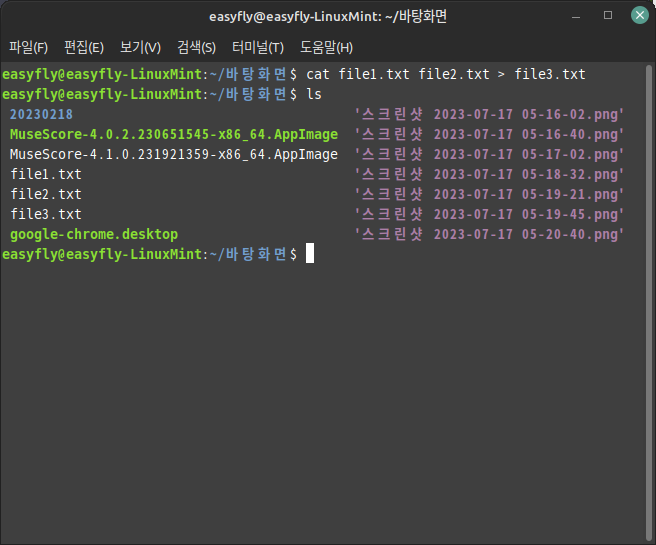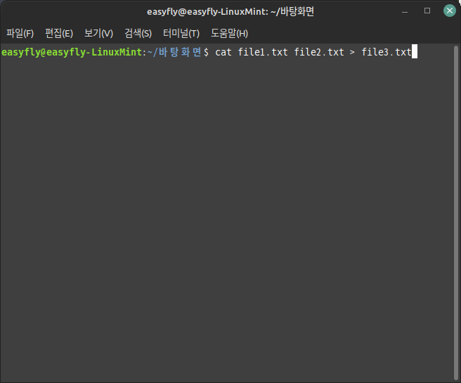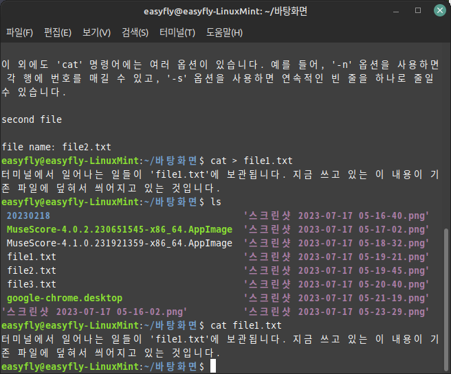 3. 파일 결합: 'cat' 명령어를 이용하여 두 개 이상의 파일을 하나로 결합할 수도 있습니다. 예를 들어, 'cat file1.txt file2.txt > file3.txt'라고 입력하면 'file1.txt'와 'file2.txt'의 내용이 합쳐져 'file3.txt'라는 새 파일이 생성됩니다.