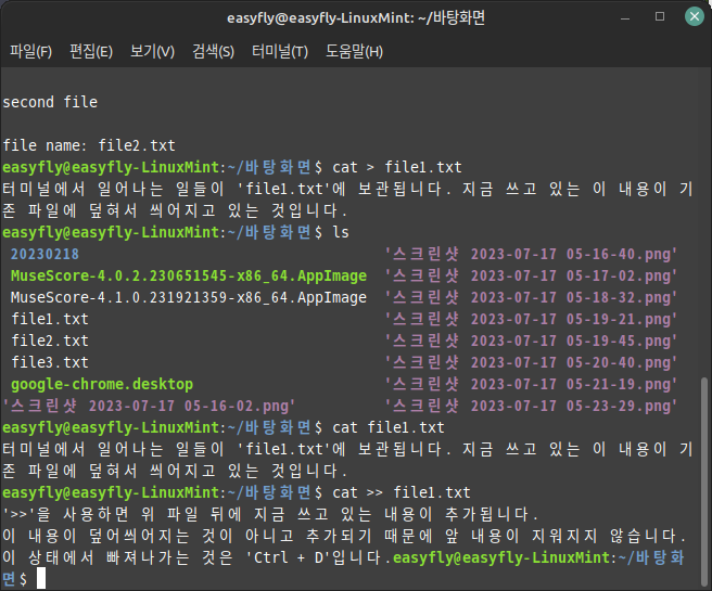 글자를 입력하고 빠져 나올 때 'Ctrl + D' 단축키를 씁니다. 그 자리에서 'cat' 상태를 빠져나왔기 때문에 위와 같은 형상을 하고 있습니다.