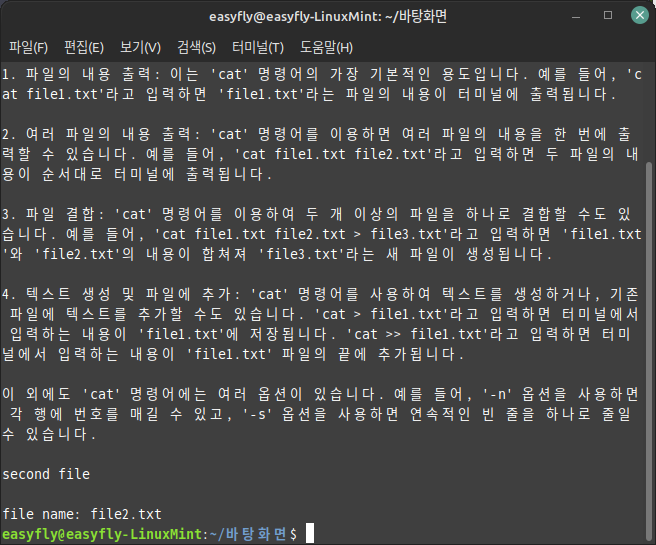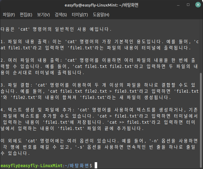 다음은 'cat' 명령어의 일반적인 사용 예입니다.
