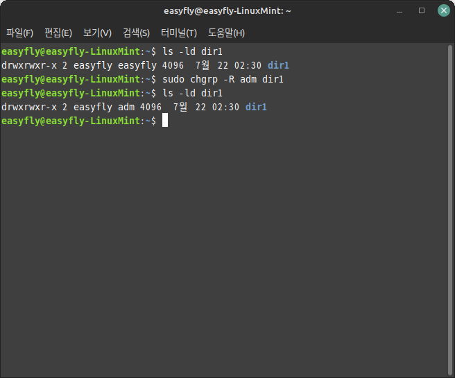 예를 들어, 'easyfly'이라는 사용자가 'adm' 그룹에 속하도록 파일 'file1.txt'의 그룹 소유권을 변경하려면 다음과 같이 명령을 실행합니다.