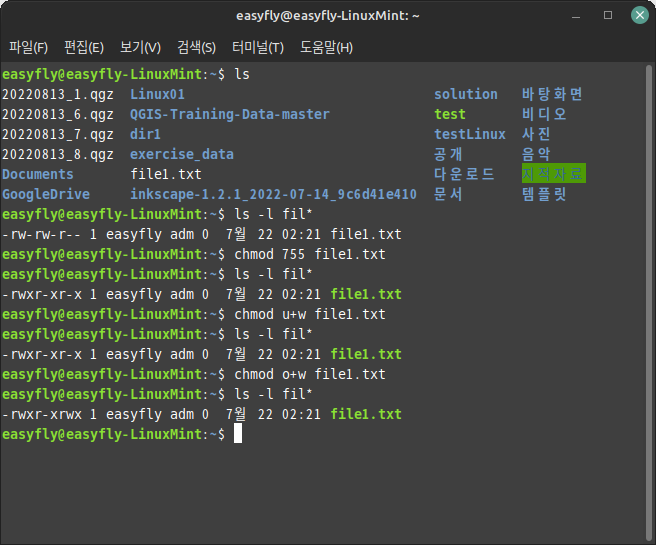 이렇게 `chmod` 명령어를 사용하여 파일 또는 디렉토리의 권한을 변경할 수 있습니다. 이를 통해 시스템의 보안을 강화하고, 사용자가 파일 또는 디렉토리에 대해 수행할 수 있는 작업을 제어할 수 있습니다.