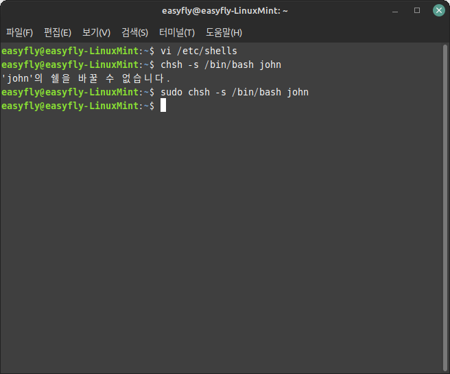 예를 들어, 사용자 'john'의 로그인 쉘을 bash로 변경하려면 다음과 같이 명령을 실행합니다.