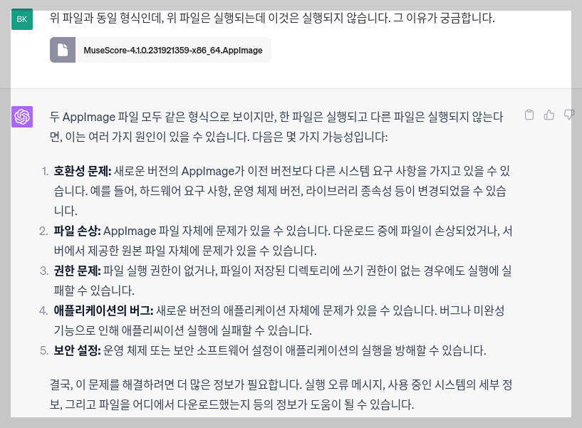AppImage 패키지에 대해 비로소 알게 됐습니다. 계속해서 물었습니다. 업그레이드한 파일이 실행되지 않는 이유가 궁금해서요. 결국 커널 버전이 문제가 되지 싶었습니다.