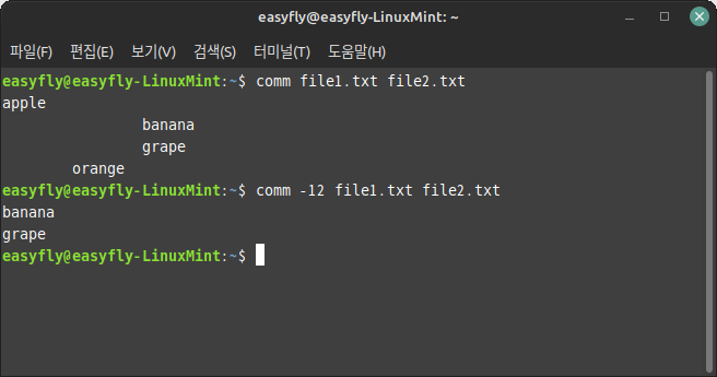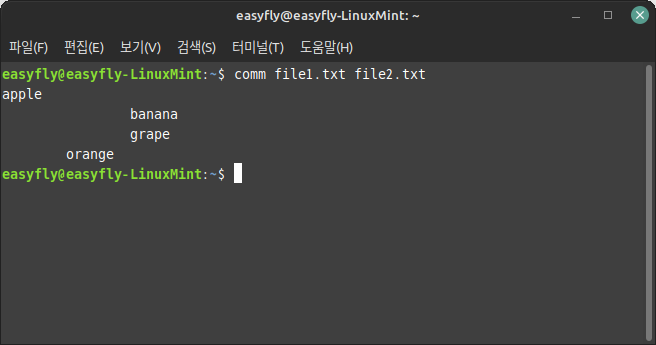 여기서 첫 번째 열(`apple`)은 `file1`에만 있는 행을 보여주고, 두 번째 열(`orange`)은 `file2`에만 있는 행을 보여주며, 세 번째 열(`banana`, `grape`)은 두 파일에 모두 있는 행을 보여줍니다.