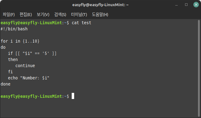 이 스크립트는 1부터 10까지의 숫자를 출력하지만, 숫자가 5일 때는 `continue` 명령어가 실행되어 `echo` 명령어가 실행되지 않습니다. 따라서 출력 결과는 5를 제외한 1부터 10까지의 숫자가 됩니다.