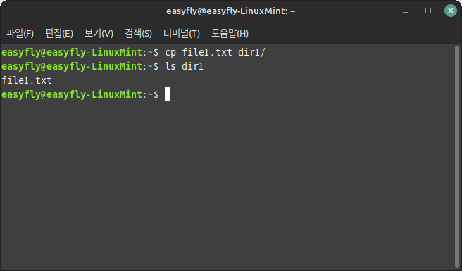 예를 들어, `file1.txt`를 현재 디렉토리에서 `dir1` 디렉토리로 복사하려면 다음과 같이 입력할 수 있습니다: