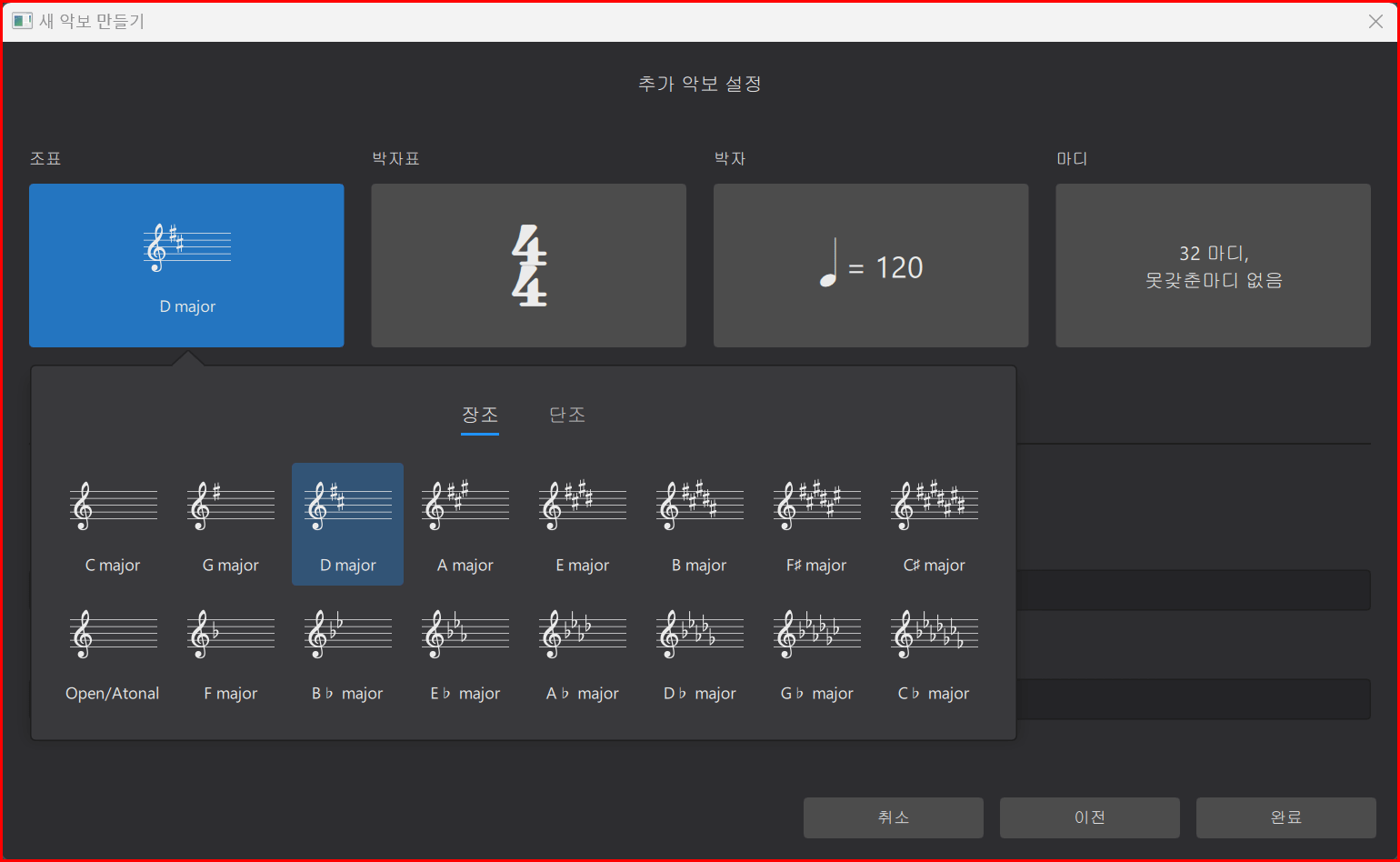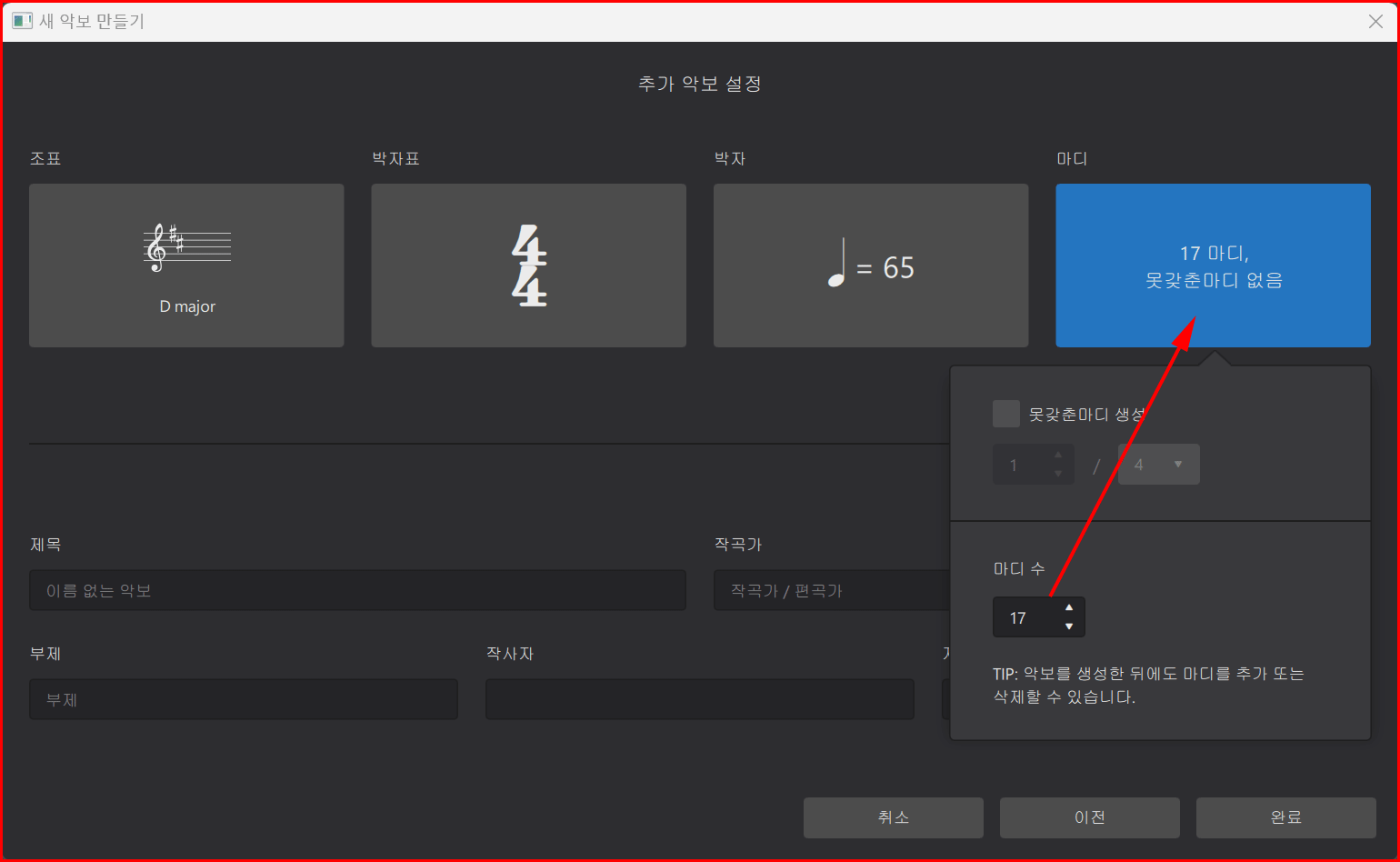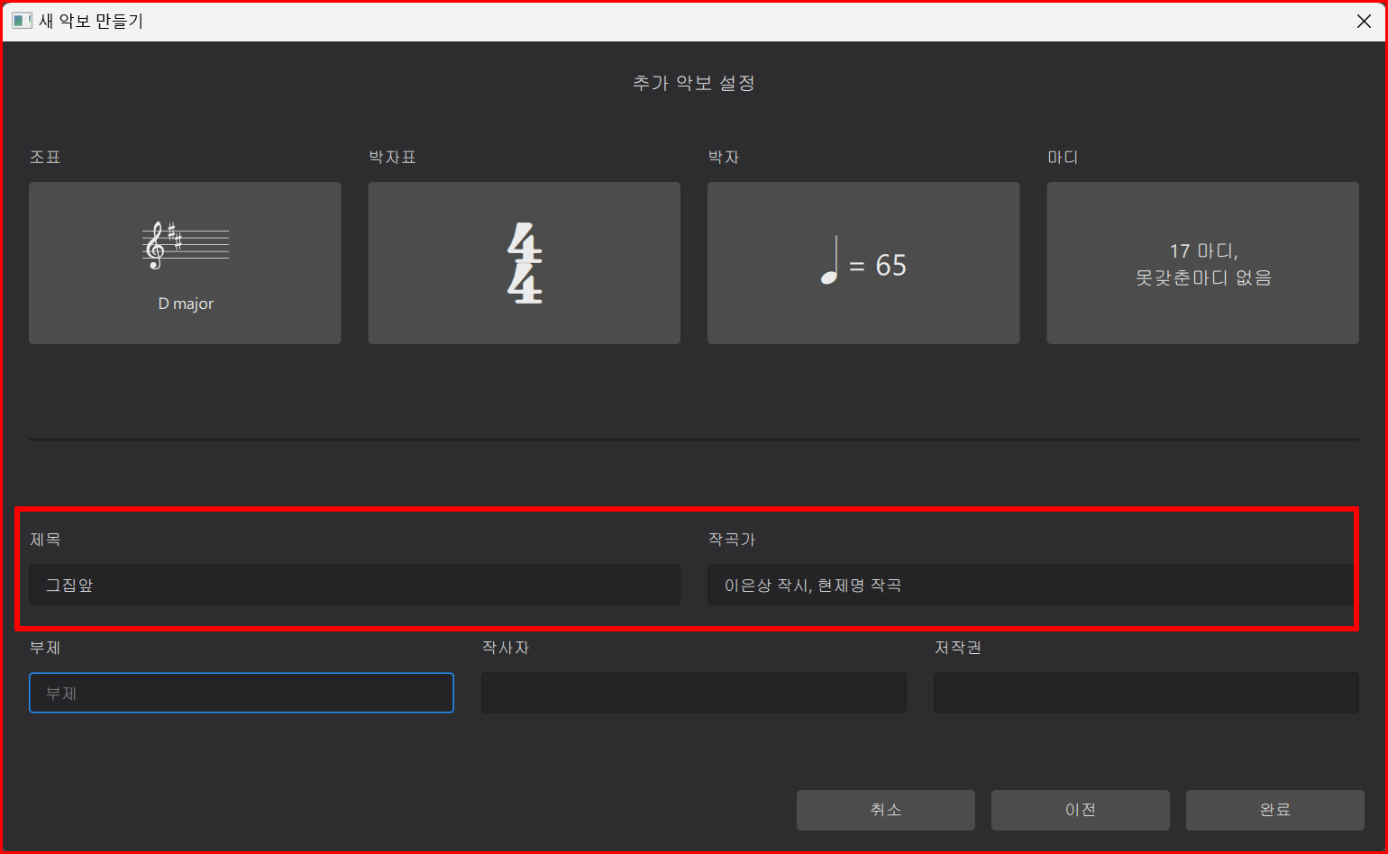 이어서 제목과 작곡가를 입력합니다. 전 시간에 지적했듯이 작곡가에 작사자와 작곡가를 같이 입력하는 것이 더 깔끔합니다. 부제가 있으면 입력하고 없으면 그대로 뒀다가 악보 생성된 뒤에 지워도 됩니다. 물론 모든 사안이 악보 입력 중에도 수정이 가능하고 지울 수도 있습니다. 미리 모든 것을 입력하고 악보를 입력하는 것이 작업이 수월합니다. '완료' 버튼을 클릭하여 마감합니다.