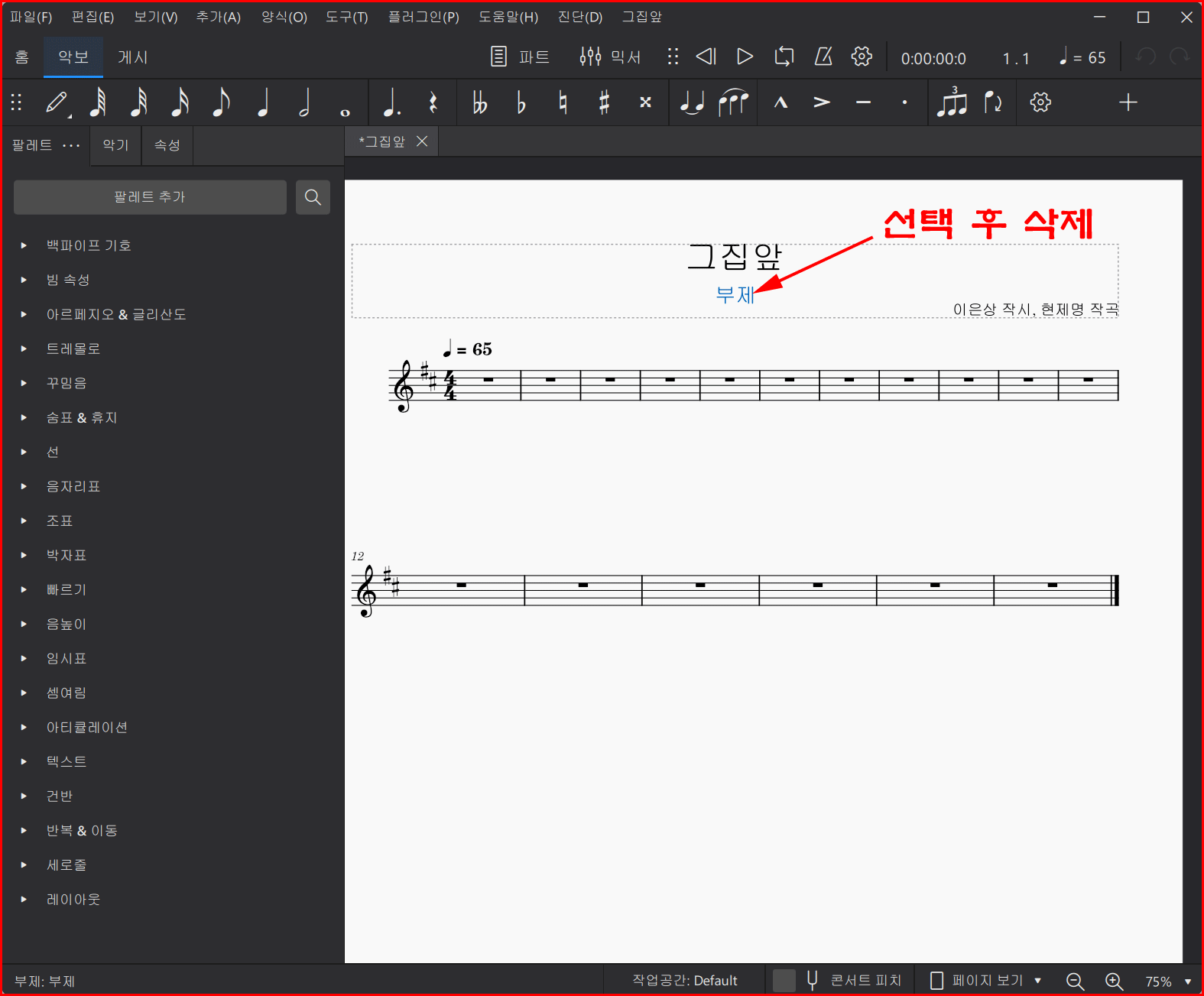 전 시간에 추가 악보 설정에 대한 내용까지 했습니다. 이 시간에는 추가 설정부터 구체적으로 진행하겠습니다. '그집앞'에 대한 정보를 미리 파악합니다. 조표는 '라장조', 박자는 4/4박자입니다. 빠르기는 '♩=65'로 하겠습니다. 마디는 모두 17마디입니다.