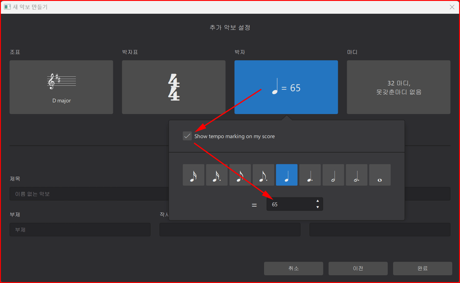 박자표는 기본이 4/4박자이기에 그대로 건너뛰고 박자를 맞춰줍니다. 여기서 'Show tempo marking on my score'를 클릭하여 활성화시키고 아래에 '65'를 입력합니다.
