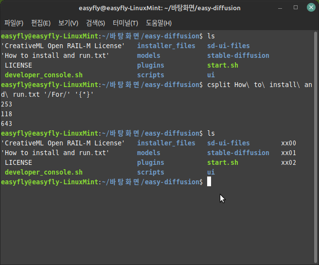 - `-s`: 이 옵션은 `csplit` 명령어가 생성하는 기본 출력을 억제합니다.