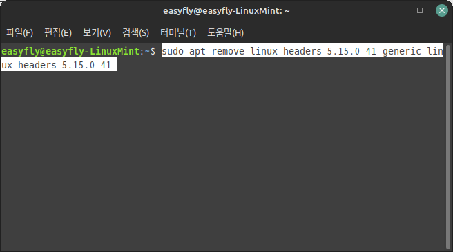예를 들어, `linux-headers-5.15.0-41-generic` 및 `linux-headers-5.15.0-41`와 같은 헤더 파일을 제거하려면 다음과 같이 입력합니다.