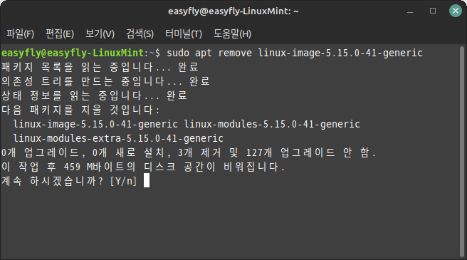 예를 들어, `linux-image-5.15.0-41-generic` 버전의 커널을 제거하려면 다음과 같이 입력합니다.