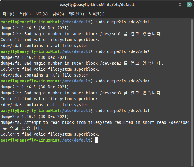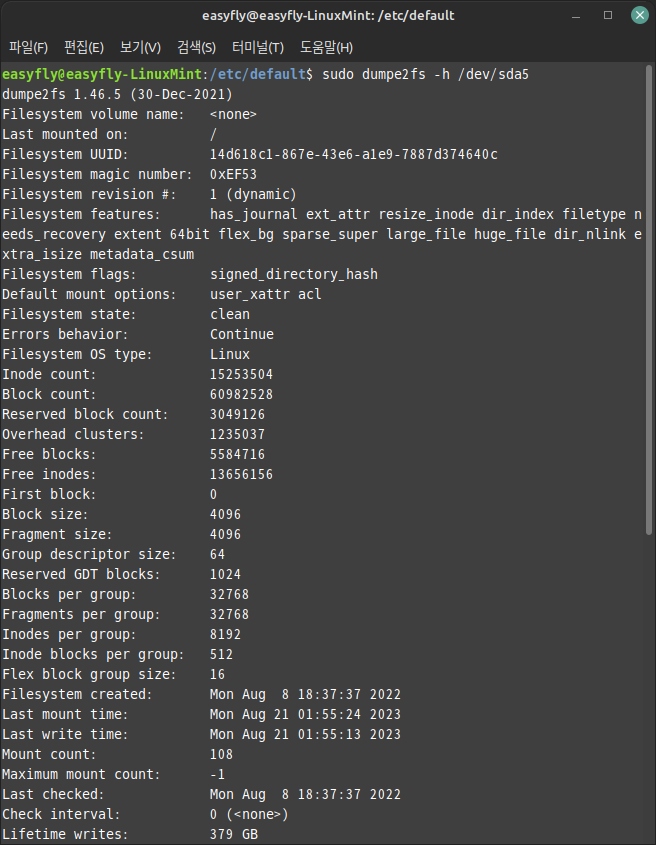 파일 시스템을 보여주는 명령어, dumpe2fs
