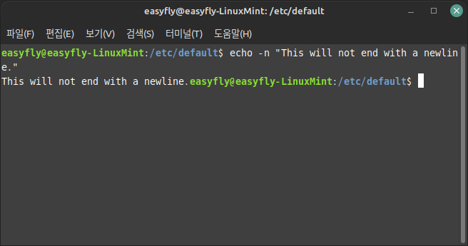 - `-n`: 새 줄(newline)을 출력하지 않습니다.