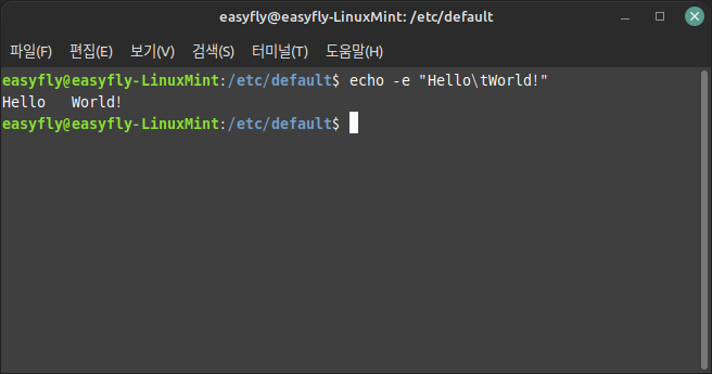 - `-e`: 문자열 내의 escape 문자를 해석하고 해당 문자로 출력합니다 (예: `\t`는 탭, `\n`는 새 줄).